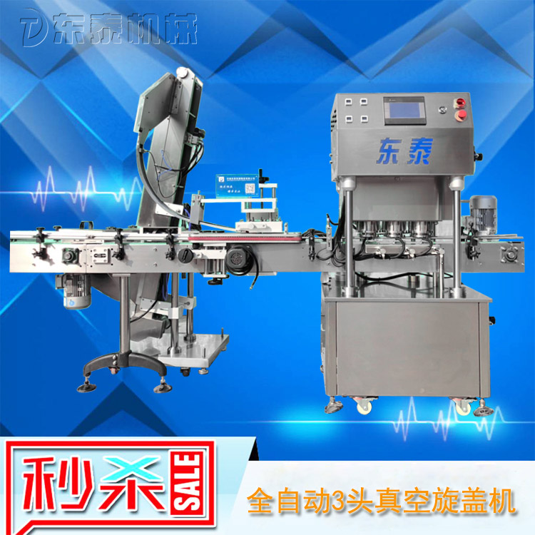 該直線式真空旋蓋機(jī)是東泰機(jī)械結(jié)合用戶使用的情況,摒棄了傳統(tǒng)轉(zhuǎn)盤式真空旋蓋機(jī)的弊端,研制開發(fā)的新型高效設(shè)備,設(shè)備自動(dòng)檢測到兩個(gè)瓶子蓋子進(jìn)入到雙頭真空旋蓋機(jī)內(nèi),旋蓋機(jī)彩色顯示屏?xí)?shí)時(shí)顯現(xiàn)旋蓋狀況,整機(jī)多點(diǎn)檢測,當(dāng)進(jìn)口無瓶無蓋、出口堵塞、定位不準(zhǔn)、瓶身傾倒均自動(dòng)停機(jī)。單個(gè)旋蓋頭達(dá)到的真空度都可以單顯示,單調(diào)整
