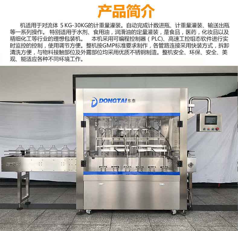 本機(jī)適用于對(duì)流體5kg-30kg的計(jì)重量灌裝。自動(dòng)完成計(jì)數(shù)進(jìn)瓶、計(jì)重量灌裝、輸送出瓶等一系列操作。 特別適用于水劑、食用油
