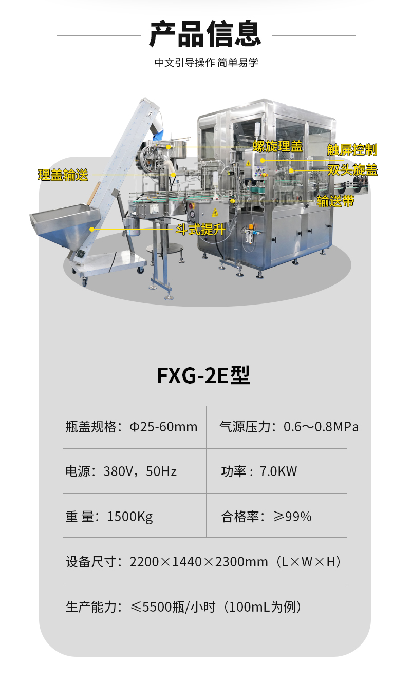 FXG-2E型全自動(dòng)雙頭跟隨式旋蓋機(jī)由理蓋輸蓋機(jī)構(gòu)、抓蓋旋蓋機(jī)構(gòu)、運(yùn)動(dòng)模塊、輸送機(jī)構(gòu)及控制系統(tǒng)組成。整機(jī)結(jié)構(gòu)簡(jiǎn)單、調(diào)整方便。該設(shè)備為我司新研制,產(chǎn)品在移動(dòng)過(guò)程中,完成旋蓋動(dòng)作。區(qū)別于常規(guī)旋蓋機(jī),在旋蓋時(shí)需要停頓,會(huì)使物料晃出瓶口,污染瓶身。該機(jī)旋蓋不停頓,有效的避免了旋蓋停頓晃液,保持瓶身清潔。