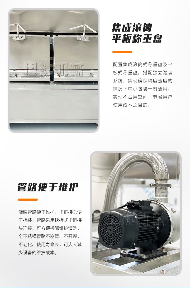 集成滾筒、平板稱重盤,一機(jī)多用,方便快捷:配置集成滾筒式稱重盤及平板式稱重盤,搭配獨(dú)立灌裝系統(tǒng),實(shí)現(xiàn)確保精度速度的情況下中小包裝一機(jī)通用,實(shí)現(xiàn)不占用空間,節(jié)省用戶使用成本之目的。