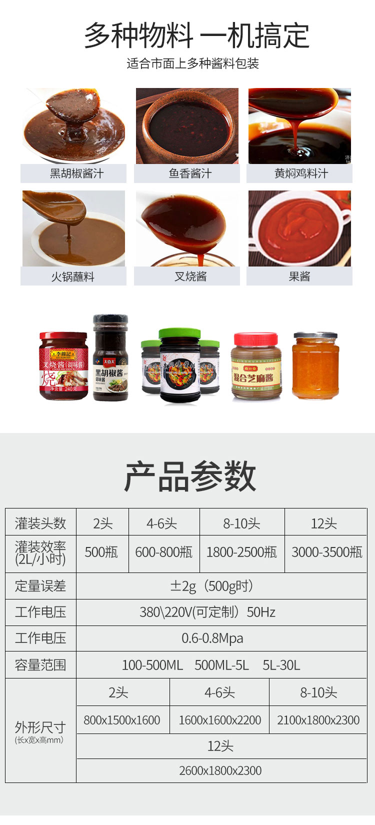 全自動醬汁灌裝機可實時根據(jù)不同產(chǎn)品做出不同的調(diào)整,操作方便,內(nèi)置各種配方一鍵保存讀取。傻瓜式操作界面。