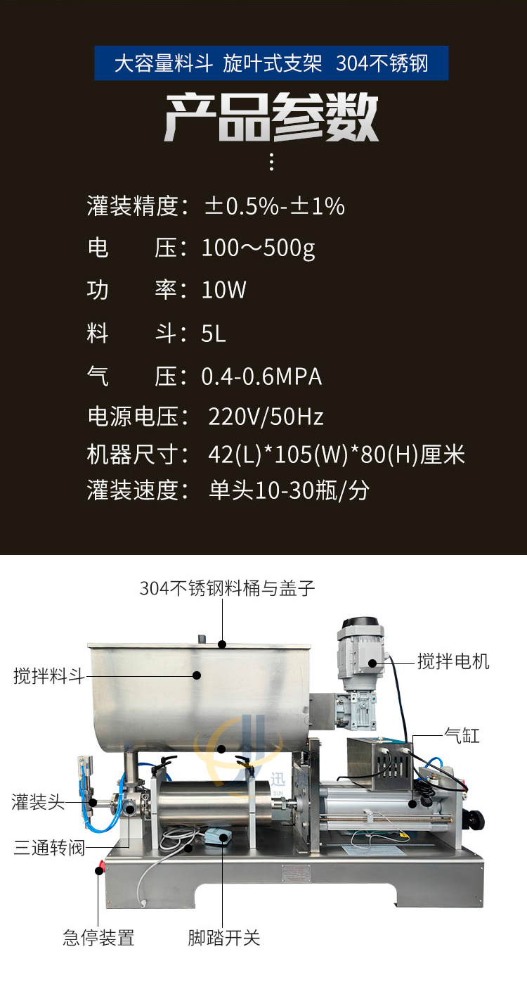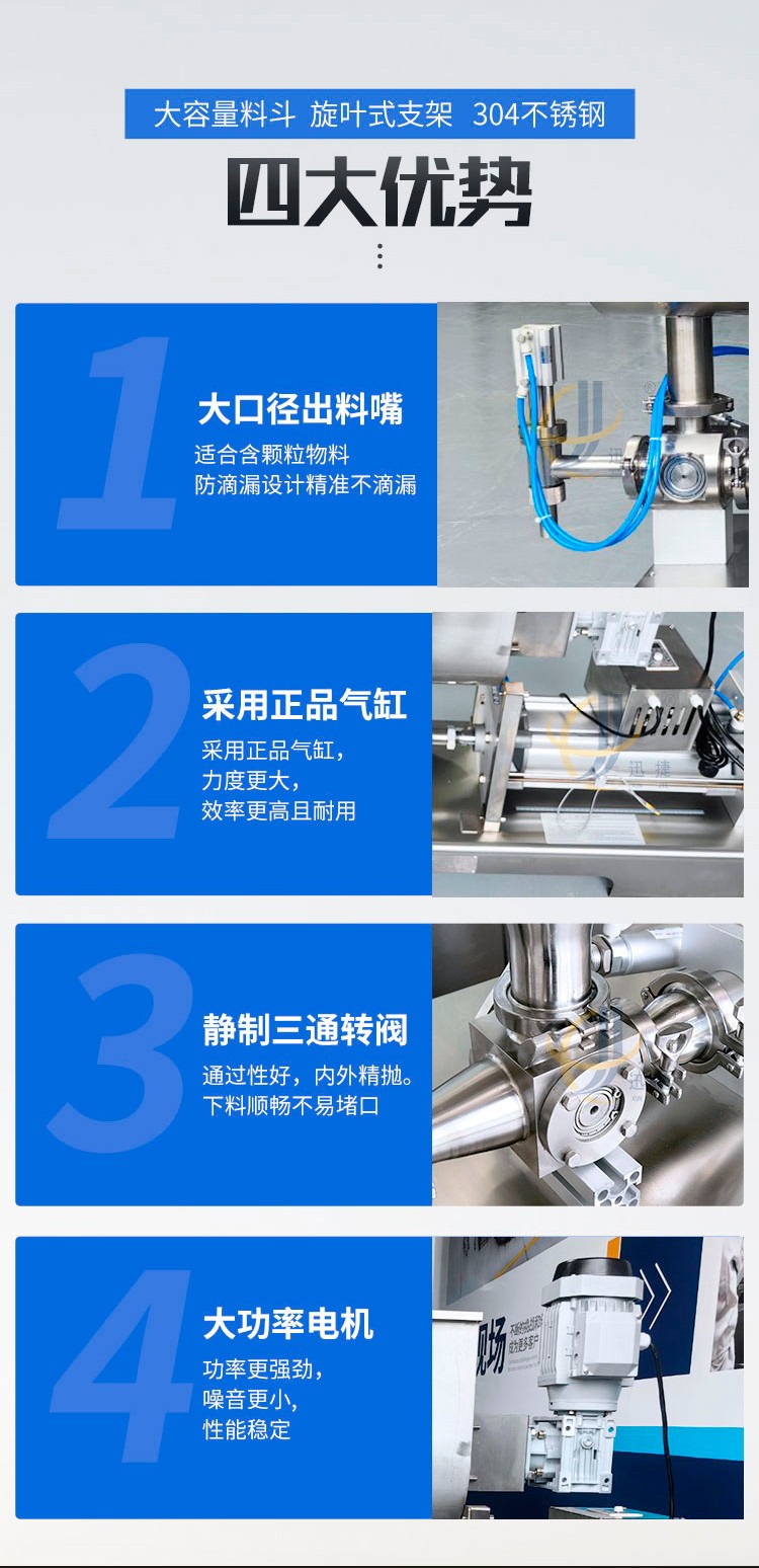 本灌裝機(jī)采用臺(tái)灣正品亞德客氣缸,力度更大,效率更高!超大不銹鋼料斗,帶自動(dòng)攪拌功能,保證灌裝產(chǎn)品,使產(chǎn)品灌裝更加均勻!灌裝嘴采用鋼精制成,精確灌裝不堵塞,防滴漏設(shè)計(jì)帶產(chǎn)品自提功能,灌裝更準(zhǔn)確!