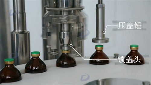 掛好蓋子后,壓蓋錘把蓋子壓到底;鎖蓋頭通過爪刀將瓶蓋與瓶身軋為一體