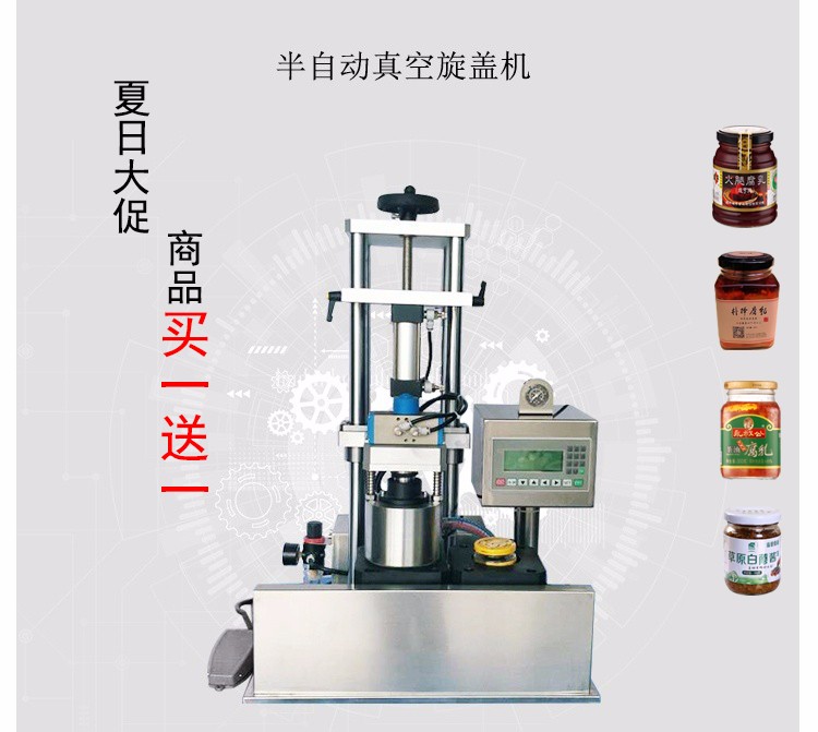 這款小型辣椒醬封口機主要用于食品包裝,采用標(biāo)準(zhǔn)馬口鐵爪式旋開蓋封口的玻璃瓶包裝??蓪崿F(xiàn)的功能是抽吸包裝容器內(nèi)的空氣使其達到設(shè)定的負壓值(即抽真空),然后旋緊蓋子。 為半自動機型,即人工進出瓶,人工配蓋,其他過程自動。